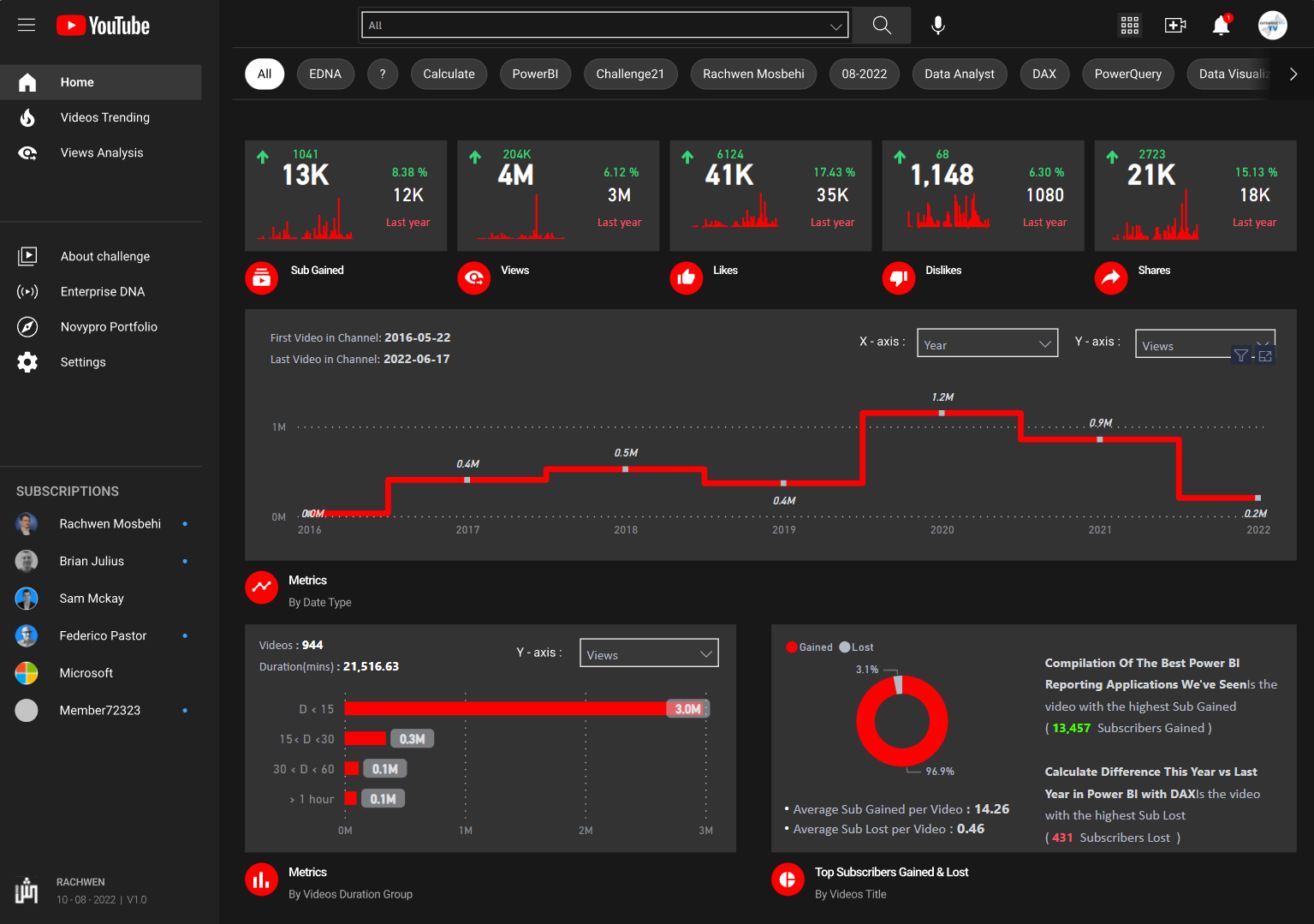 This week I want to a highlight this fantastic YouTube Analysis dashboard by Rachwen Mosbehi. I discovered this as it was submitted as part of the Enterprise DNA challenge and won it, so massive congratulations to Rachwen and Stellify BI.