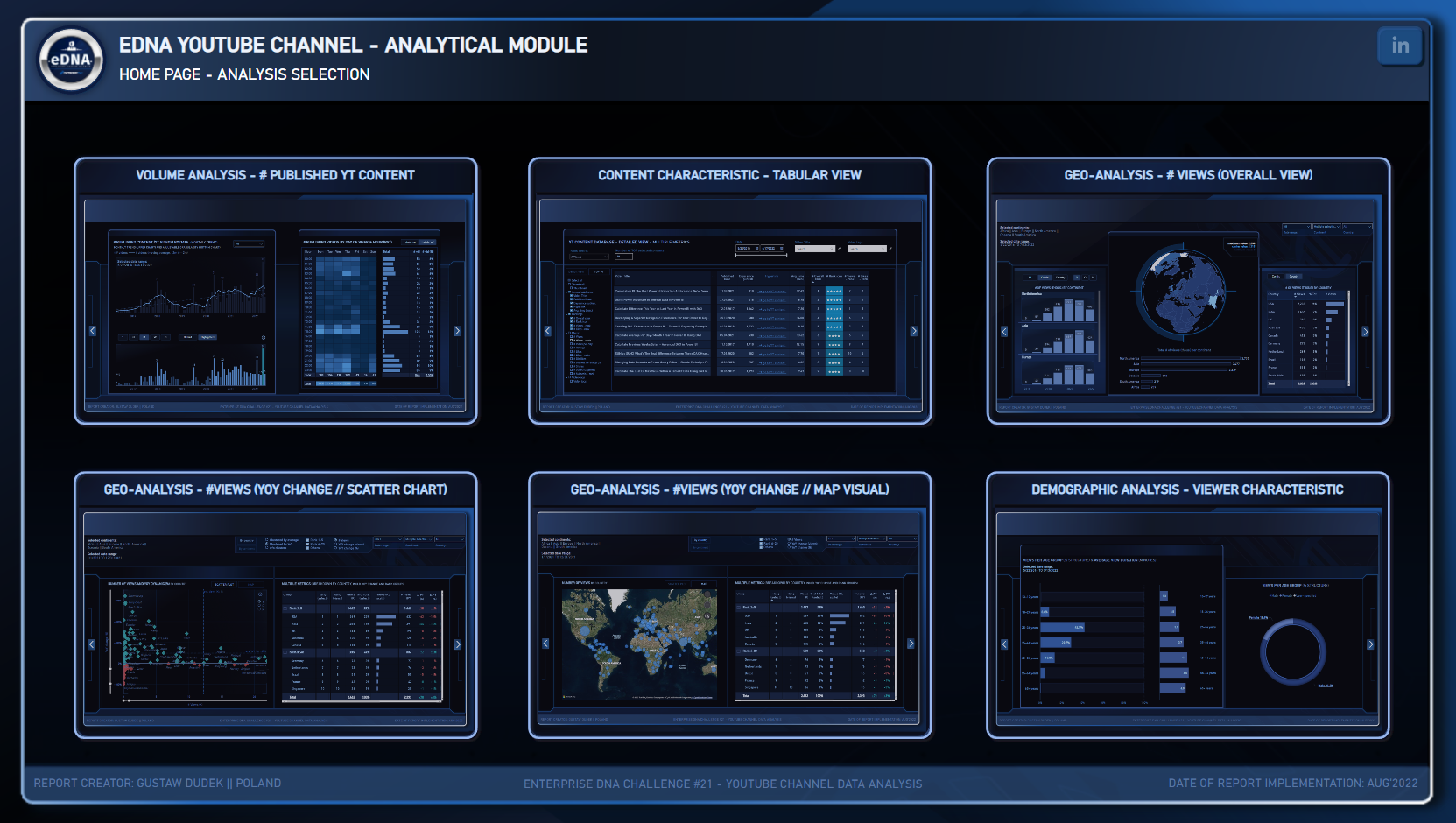 Have you seen this report built by Gustaw Dudek? It’s a dashboard that analyses YouTube Channel’s performance and as a YouTube content creator I found this report and his design quite inspirational to be honest! Here are some key features I liked from his approach and design;